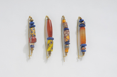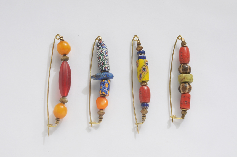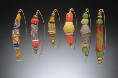I was seeking a method to hold a small composition of important old beads. I came across this ancient format known as a "fibula." The beads are strung on thick brass wire, which is bent into the shape of a safety pin. They are wonderful on a thick sweater, a wool scarf or a winter coat. One client has a collection of them on a piece of fabric hung on the wall.